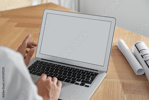 Woman using video conference to communicate with her coworkers at wooden table, closeup