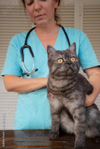 Woman veterinarian doctor holds sick cat close-up. Diagnostics of pets health in veterinary clinic concept.