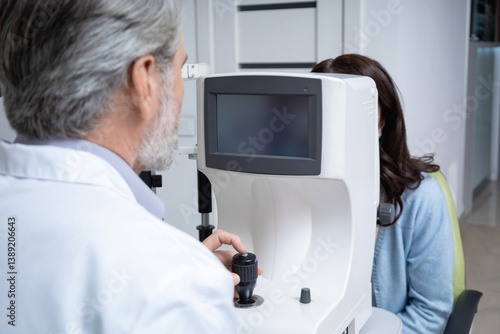 Woman visiting optical clinic for eyesight test with ophthalmologist