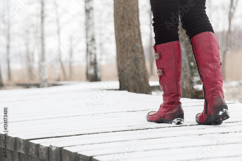 Woman walking in winter day. Winter boots on legs. Active lifestyle at nature.