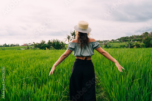 Woman walking on rural path with arms spread