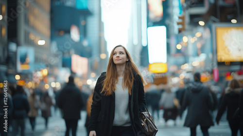 woman walking through bustling city square, surrounded by blurred crowds and bright lights, exuding sense of curiosity and wonder