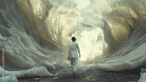 Woman walking through ethereal landscape with dramatic clouds and surreal textures