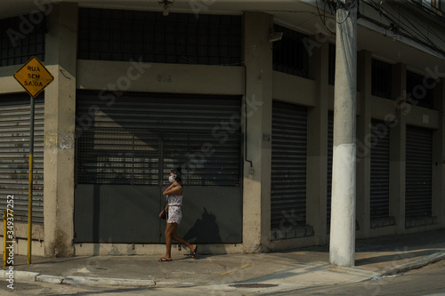 Woman walks wearing face mask to protect herself from the virus in the pandemic.
