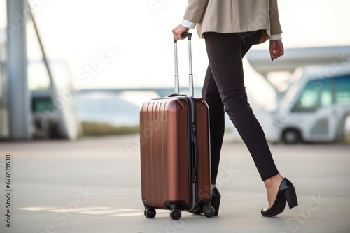 Woman walks with small suitcase with personal belongings moving along airport looking for gate to board plane. Air travel and wanderlust in adulthood. Moving to another country with hope for new life