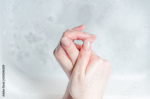 woman washes her hands over water with foam