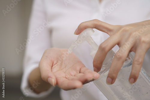 Woman washing hands with alcohol gel or sanitizer gel. corona virus or Covid-19 protection.