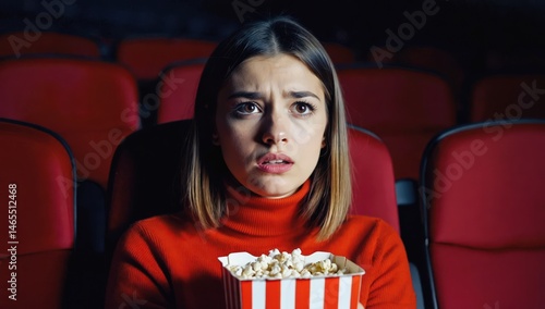 woman watching a scary movie at the cinema