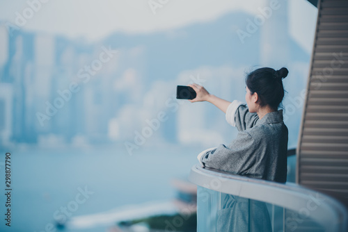 Woman wear bathrobe using smartphone on balcony