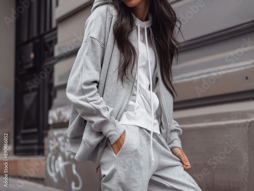 Woman Wearing a Grey Hoodie and Sweatpants Standing in an Urban Setting