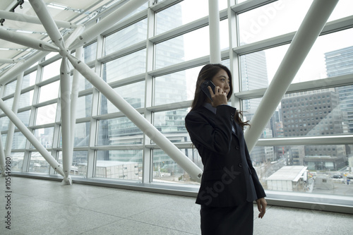 Woman wearing a suit with a phone in a modern office