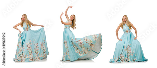 Woman wearing ball dress isolated on white
