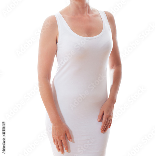 Woman wearing blank vest isolated on white background.