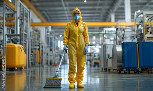 Woman wearing equipment and yellow protective clothing doing cleaning work in factory, Generative AI