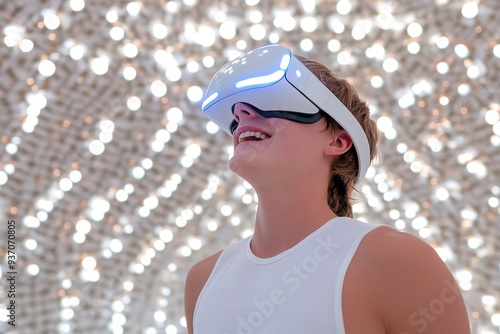 Woman wearing futuristic VR headset surrounded by sparkling lights experiencing a dazzling digital world that merges reality with fantasy in a captivating immersive environment