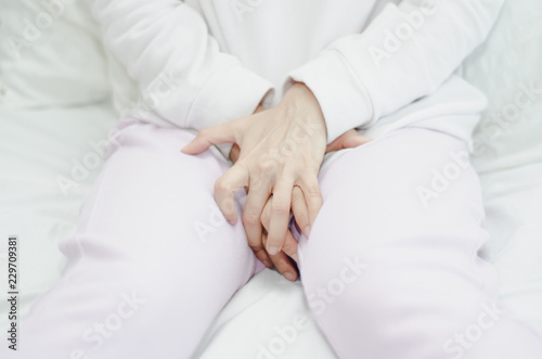 Woman wearing pink pants the itching on vaginal. Genital itching caused by fungus in underwear.Blackboard For text input.Warm tone.Do not focus on objects.