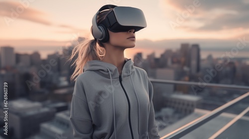 Woman wearing VR headset standing on rooftop among tall buildings in the background.