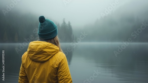 Woman wearing yellow raincoat enjoying tranquil lake view in foggy forest