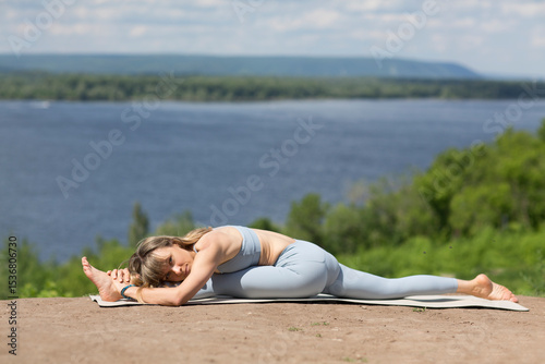 Woman wearing yoga clothes woman does splits to stretch on a sunny summer day in nature. Healthy and sport lifestyle. Fitness sport girl doing gymnastics fitness exercise.