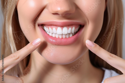 Woman with a beautiful white smile pointing with her hands to her teeth.