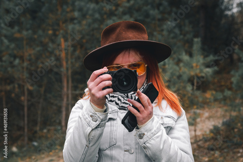 woman with a camera taking photos in the forest. Dressed leather hat and yellow sunglasses. Autumn day