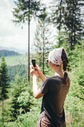 woman with a camera. The girl takes pictures of mountain landscapes