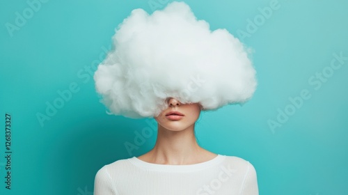Woman with a fluffy cloud on her head against a blue background representing creativity and imaginative thinking