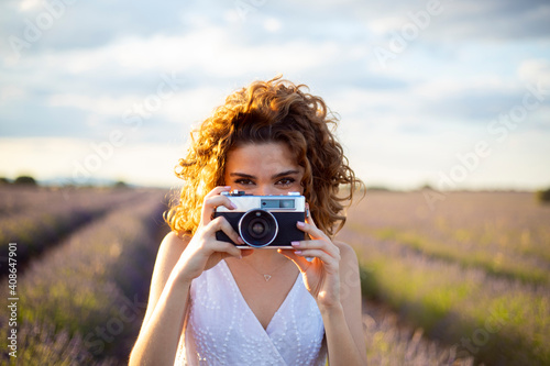 woman with a photo camera in a lavender field