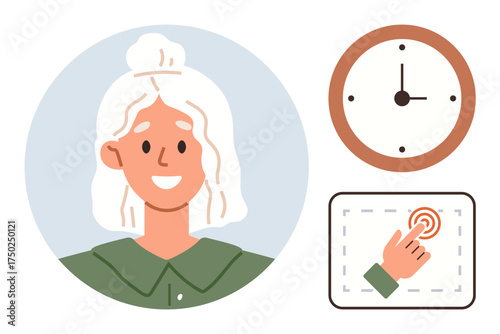 Woman with a smile, minimal clock face showing time, tap gesture on touchscreen. Ideal for productivity, time management, decisions, technology, communication, mindfulness simple flat metaphor