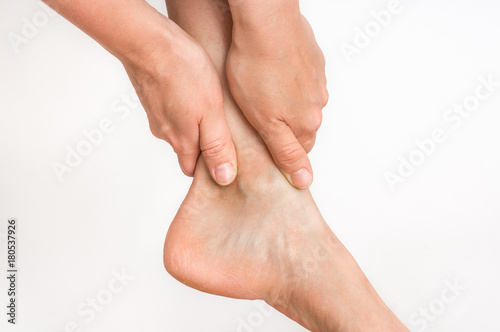 Woman with ankle pain holding her aching leg