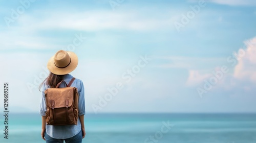 Woman with backpack embraces breathtaking ocean view journey of exploration and discovery