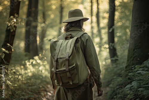 Woman with backpack hiking in forest at springtime. Woodland with flowering wild garlic. Adventure in beautiful nature. Generative Ai.