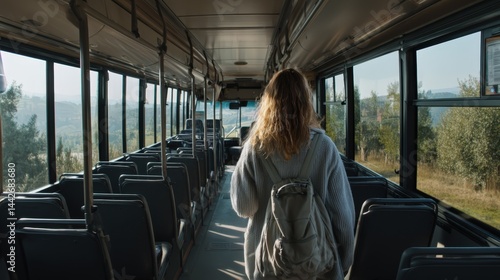 Woman with Backpack Rides Public Transportation Bus Scenic View Travel Journey
