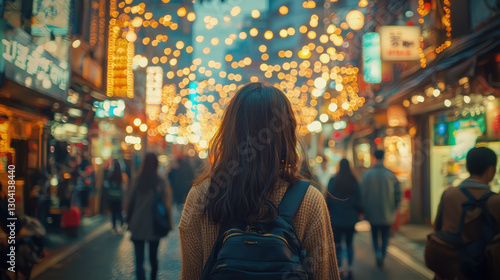 woman with backpack walks through vibrant city street adorned with glowing lights, creating lively and bustling atmosphere. scene captures essence of urban life and exploration