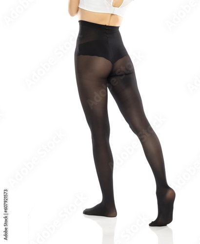 Woman with beautiful long legs and black stockings, isolated on white background. Rear, back view
