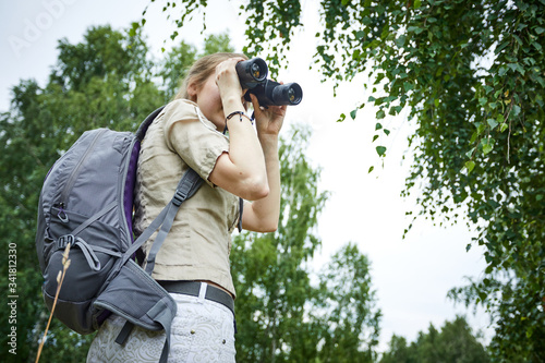 woman with binoculars in forest