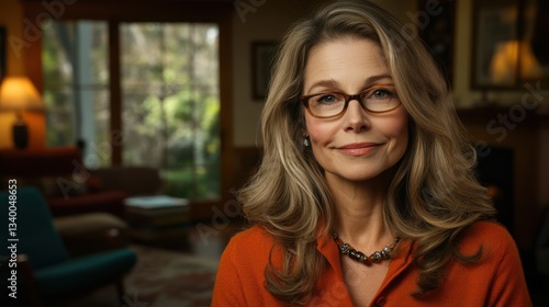 Woman with blonde hair and glasses in a cozy indoor room with a view of greenery