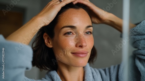 Woman with blonde hair, applying skincare products in a bathroom mirror.