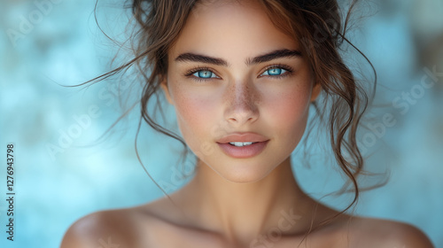 Woman with blue eyes and freckles gazing directly at camera against soft blue background. Young female with natural makeup displaying gentle expression highlighting facial features