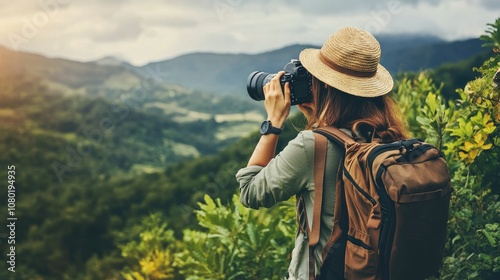 Woman with camera in hand, taking photos of scenic mountain landscape.