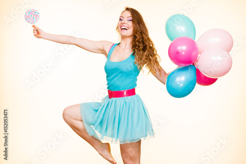 Woman with colorful balloons and lollipop