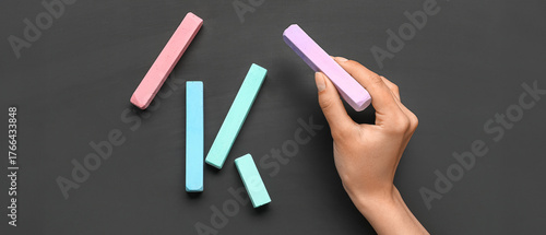 Woman with colorful chalks on blackboard, top view