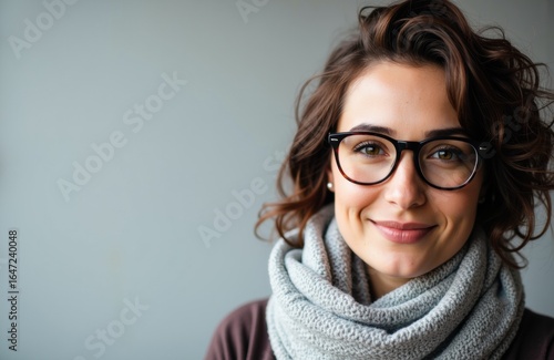 Woman with curly brown hair wearing glasses and a cozy gray scarf smiling at the camera