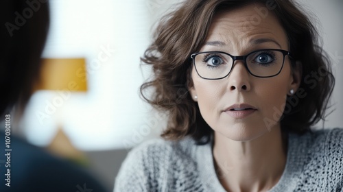Woman with curly hair and glasses engaged in an intense conversation inside a cozy living room during daytime