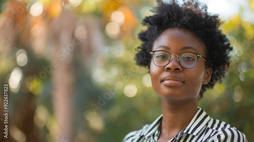 Woman with curly hair and glasses posing outdoors in natural light during daytime