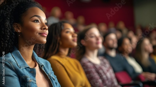 Woman with Curly Hair Looking Up in a Crowded Auditorium