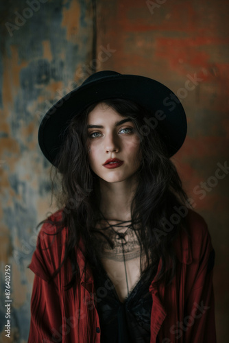 Woman with dark hair and a black hat, wearing a red jacket, set against a moody, textured background, exuding a mysterious and stylish vibe