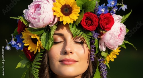 Woman with eyes closed wearing a colorful flower crown, beauty shot
