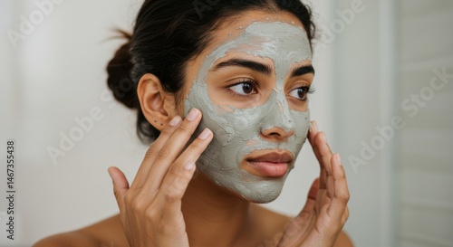 Woman with facial mask applying it with fingers in a bathroom setting.