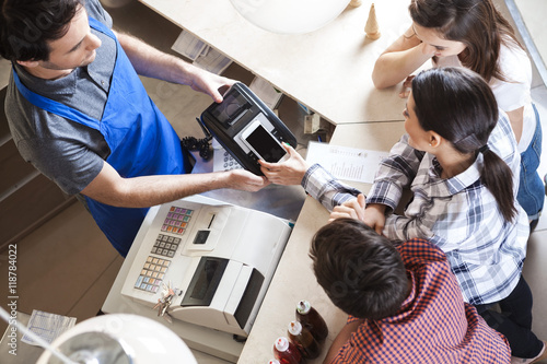 Woman With Family Making Payment With NFC Technology
